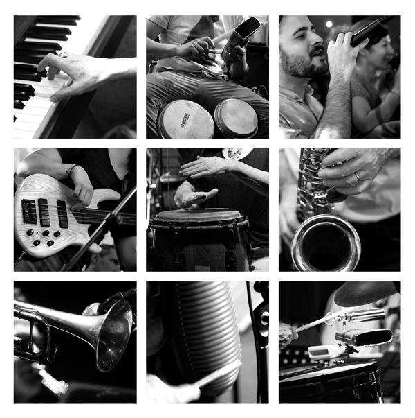 Section rythmique > piano, basse, percussions : clave, congas, bongos/campana, timbales, güiro, maracas…